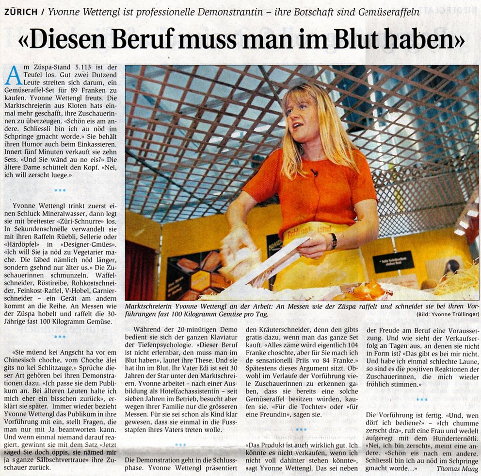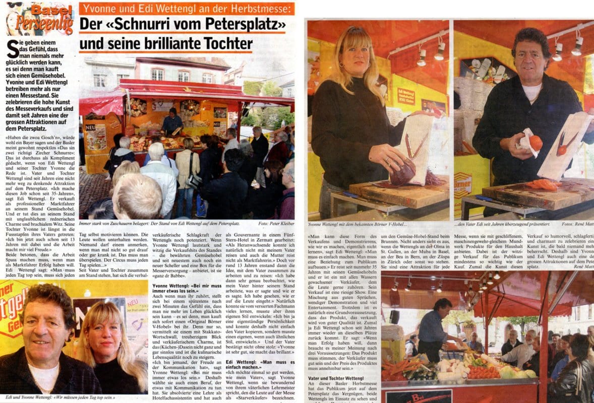 Über 25 Jahre war ich mit diversen Artikeln, darunter vor allem mit dem Börner Gemüsehobel an sämtlichen Messen und Märkten in der Schweiz unterwegs. Anfangs mit meinem Vater Edi Wettengl, an den sich viele sicher noch erinnern können. Danach führte ich die Firma 6 Jahre zusammen mit meinem Bruder weiter.